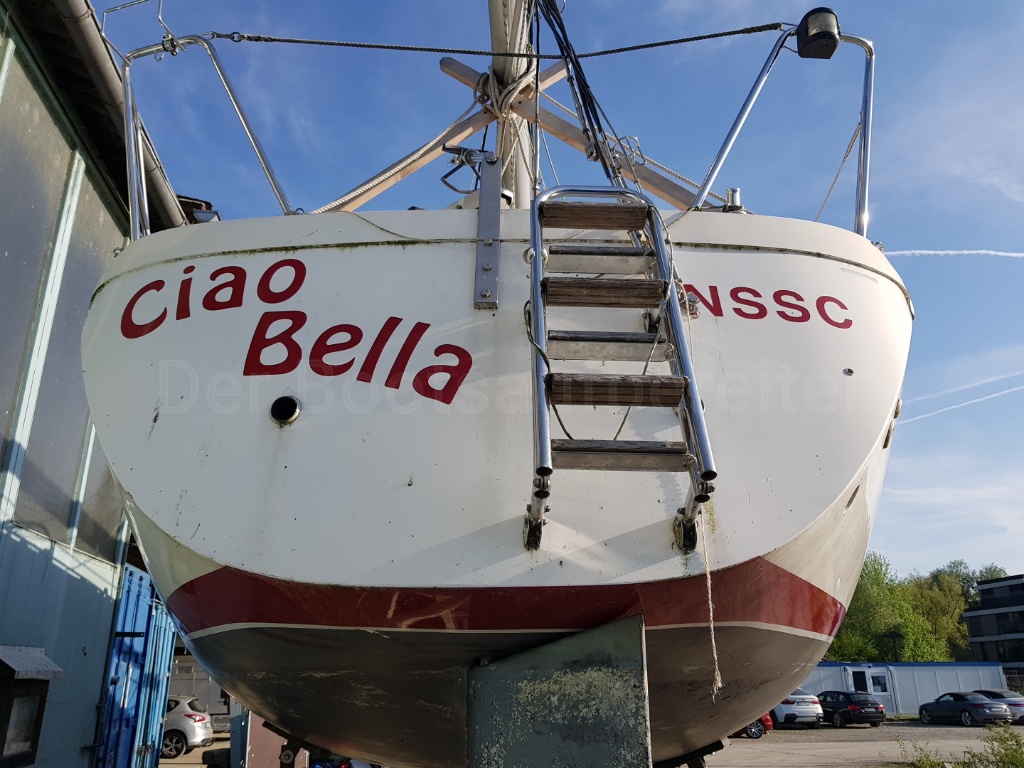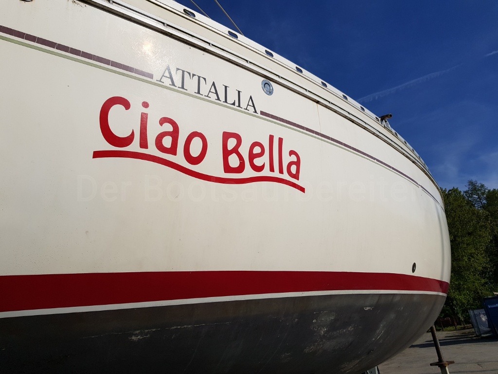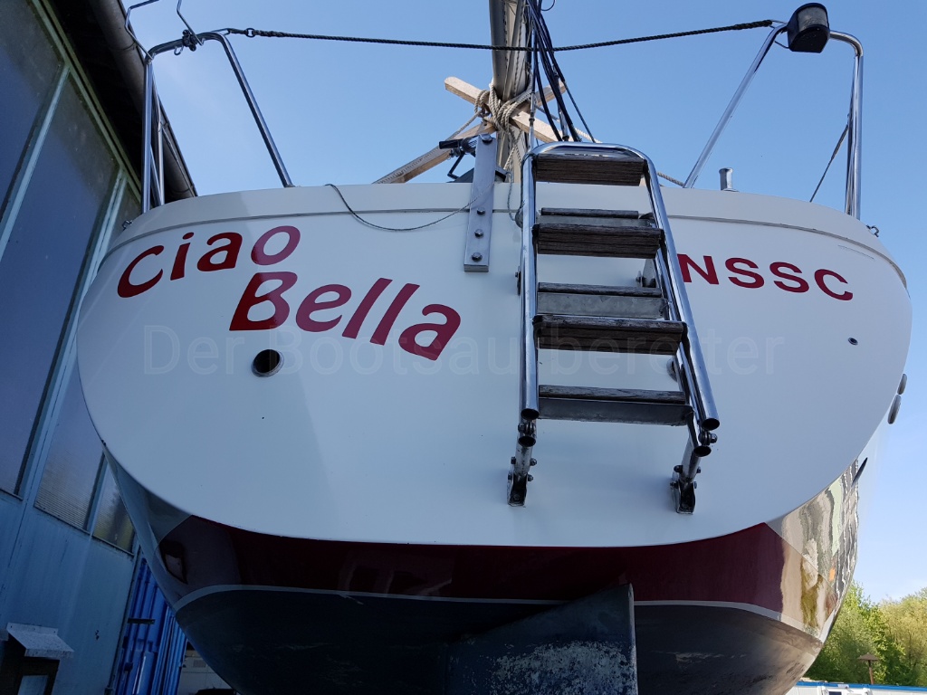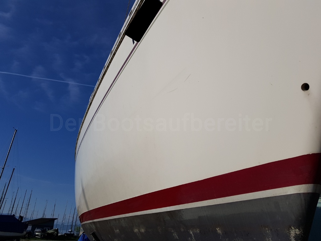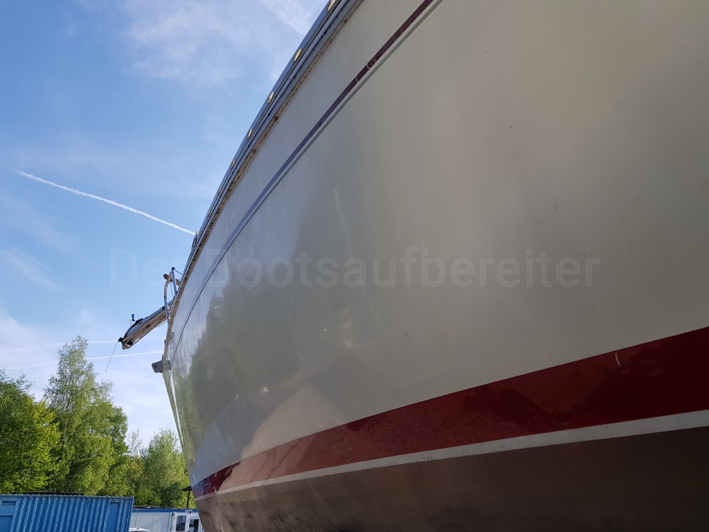 Es war an der Zeit, diese Attalia 32 aufzubereiten, polieren und wieder zu versiegeln. Sie stand im Großen und Ganzen durch die gute Pflege des Eigners ganz gut da. Das Ausgrauen des Gelcoats war schon deutlich zu erkennen.