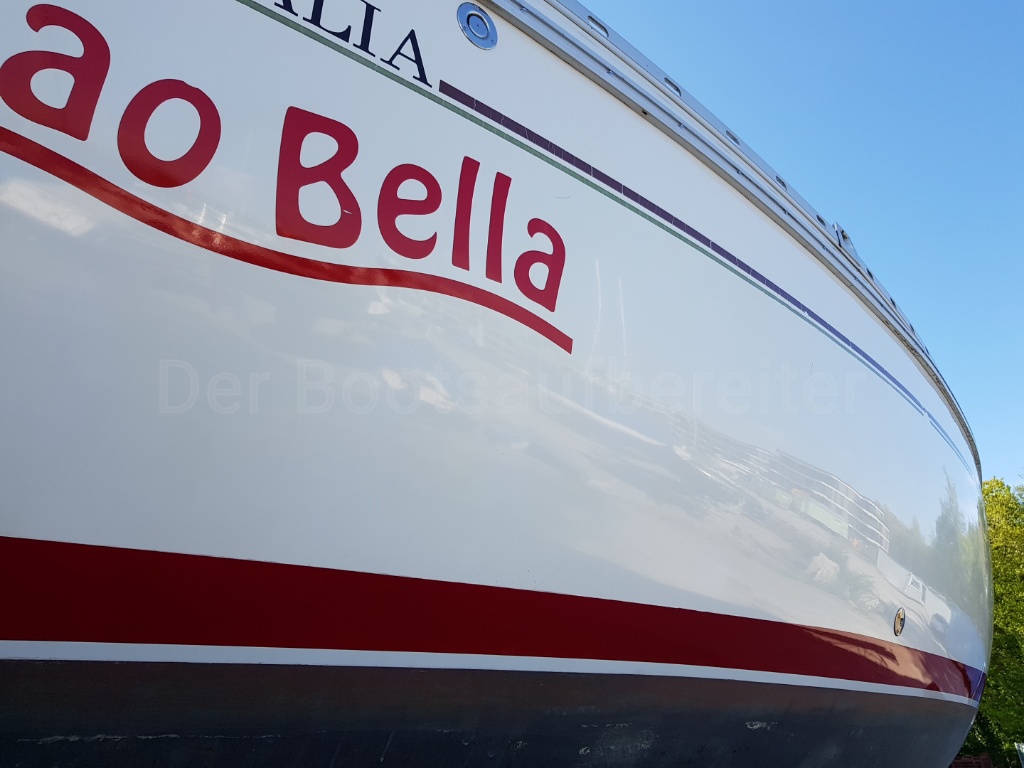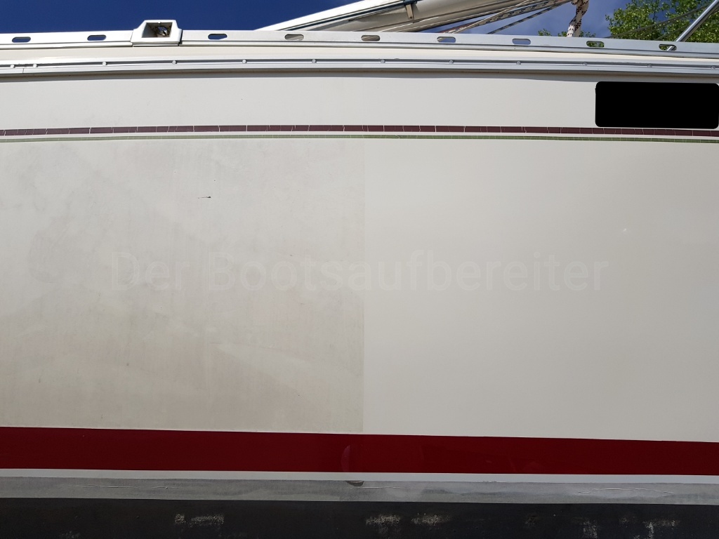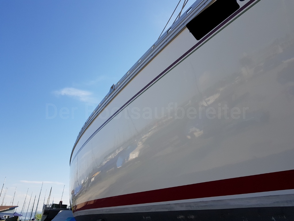 Damit das Gelcoat wieder geschützt ist wurde die Attalia 32 mit der Langzeitversiegelung von NautiCare versiegelt.
