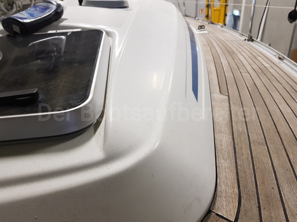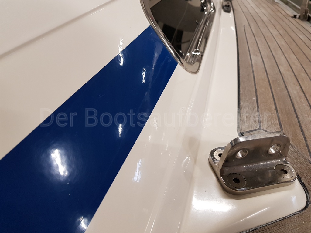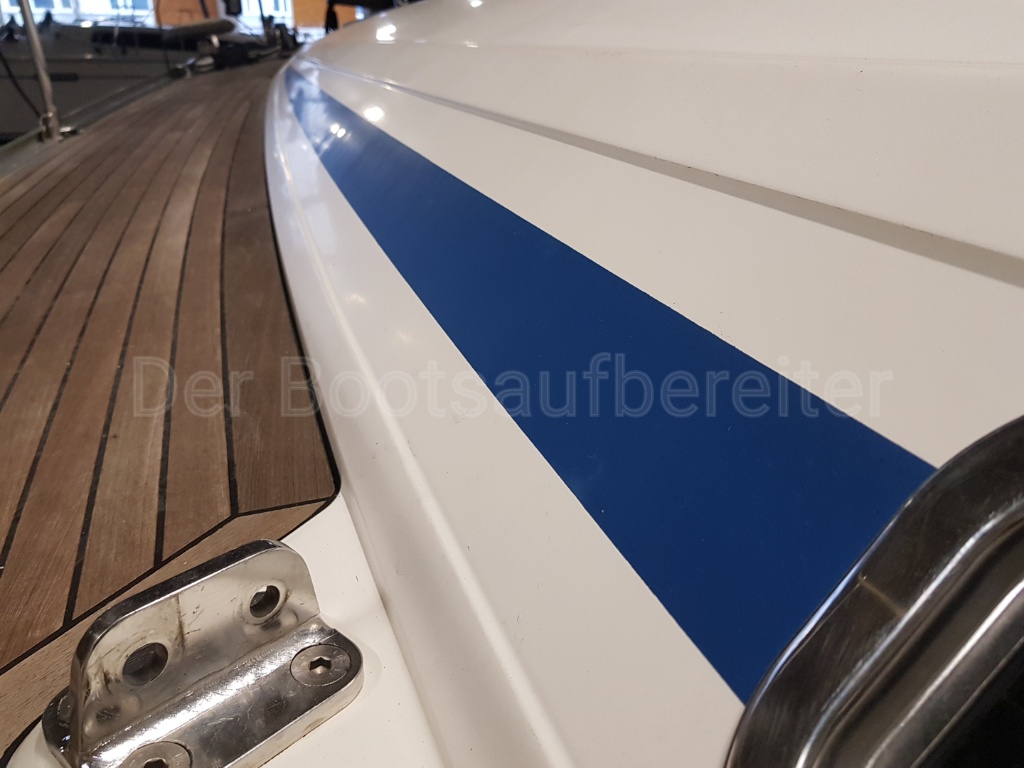 Um die Verwitterung der Bavaria 34 wieder zu entfernen wurde die Bordwand zuerst mit einer groben und anschließend mit der mittleren Schleifpolitur aufpoliert. Zum Schluss kam noch eine Finish-Politur zum Einsatz.
