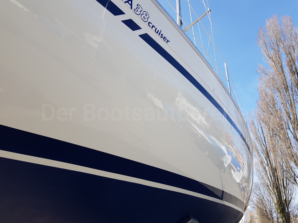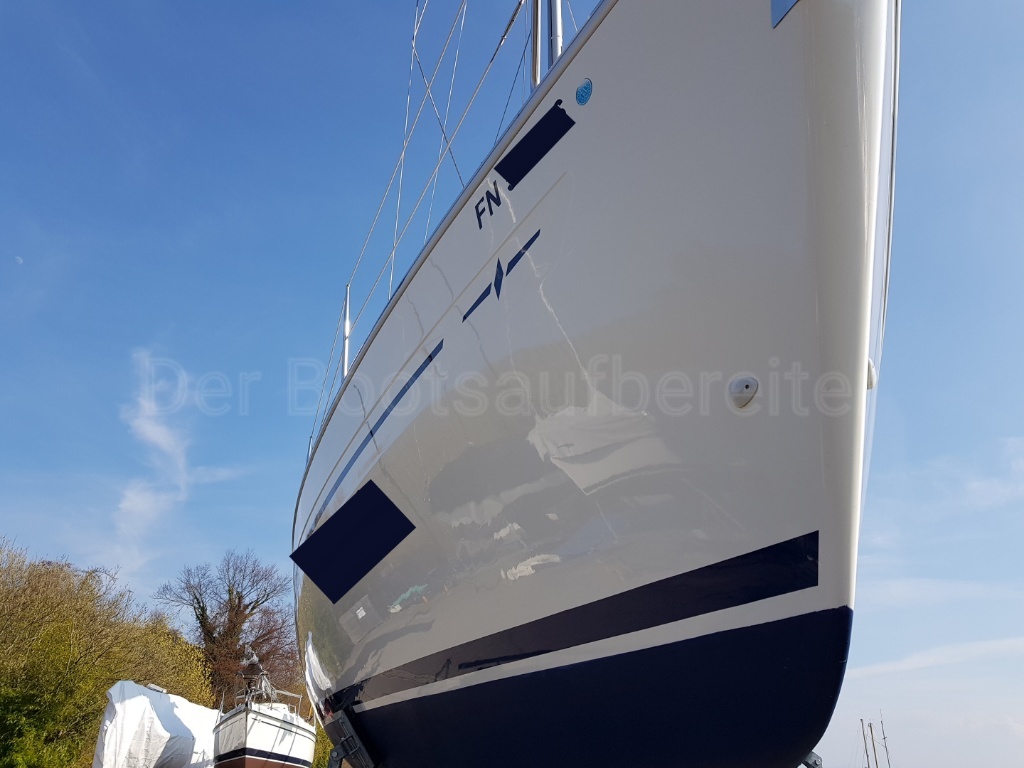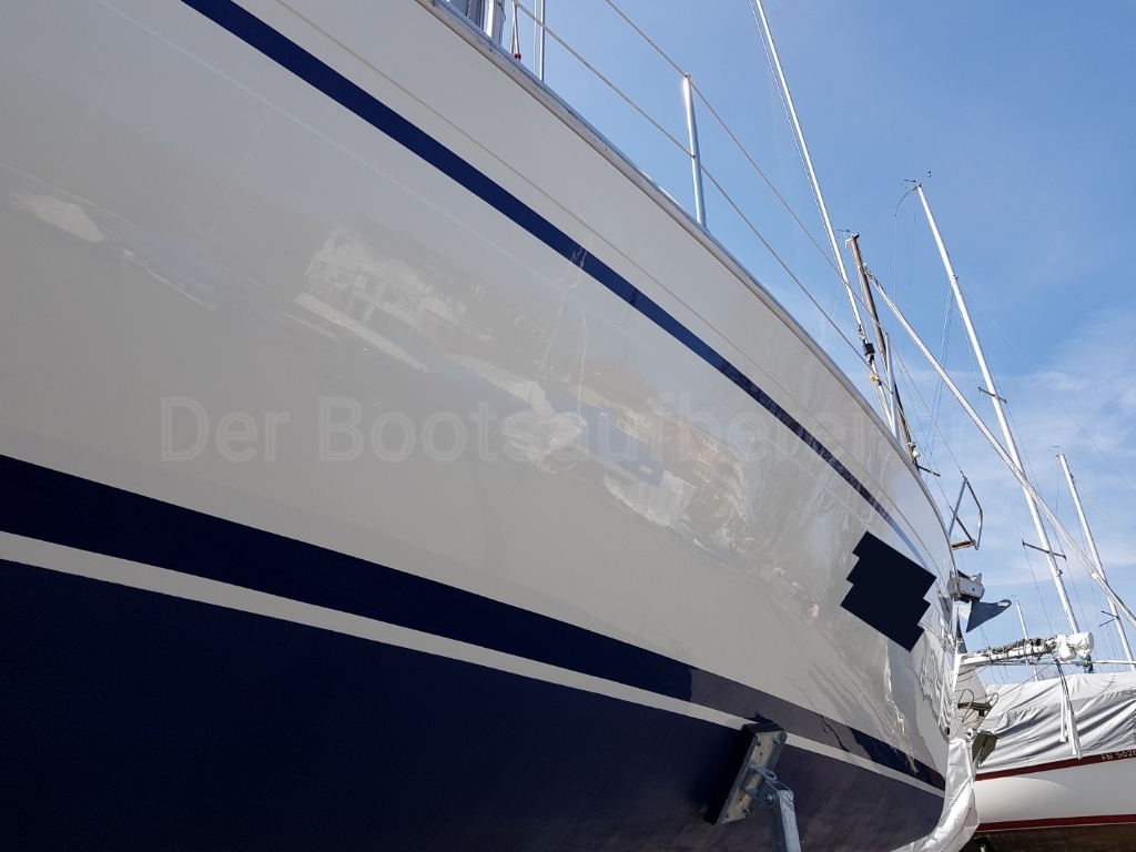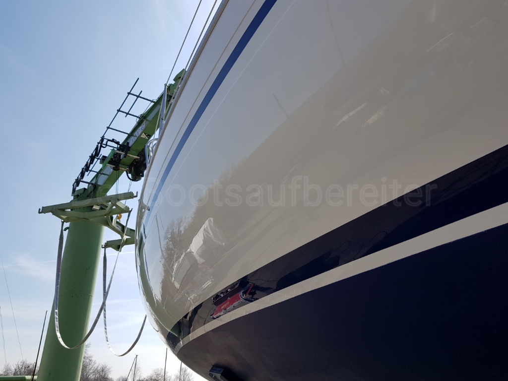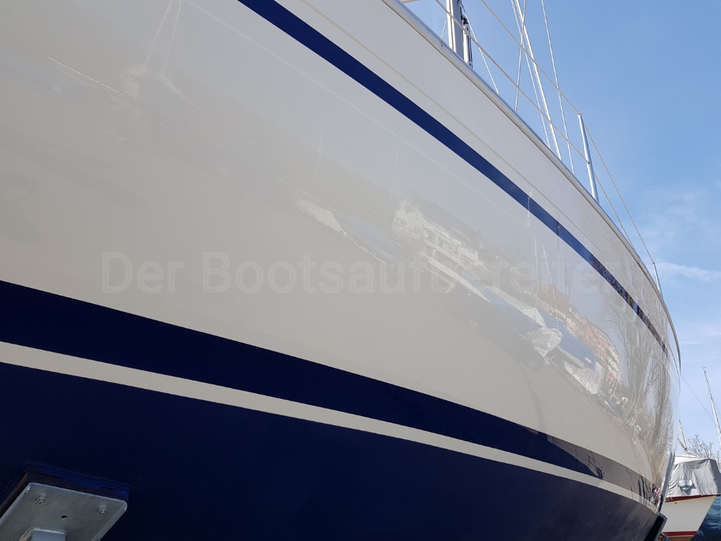 Auf der Bordwand dieser Bavaria 38 waren nur leichte Spuren der Verwitterung zu erkennen. Dennoch hatte der Eigner den Wunsch, sie wieder aufzufrischen und neu zu versiegeln/schützen.