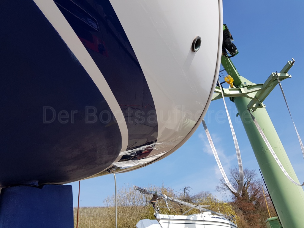 Generell ist dieses vorzeitige Vorgehen kein Fehler. Denn für das Gelcoat ist es deutlich besser, wenn dieses nur mit leichten Polituren bearbeitet werden muss. Aus Zeitgründen wurde vorerst nur der Rumpf poliert. In Kürze folgt dann noch das Deck.