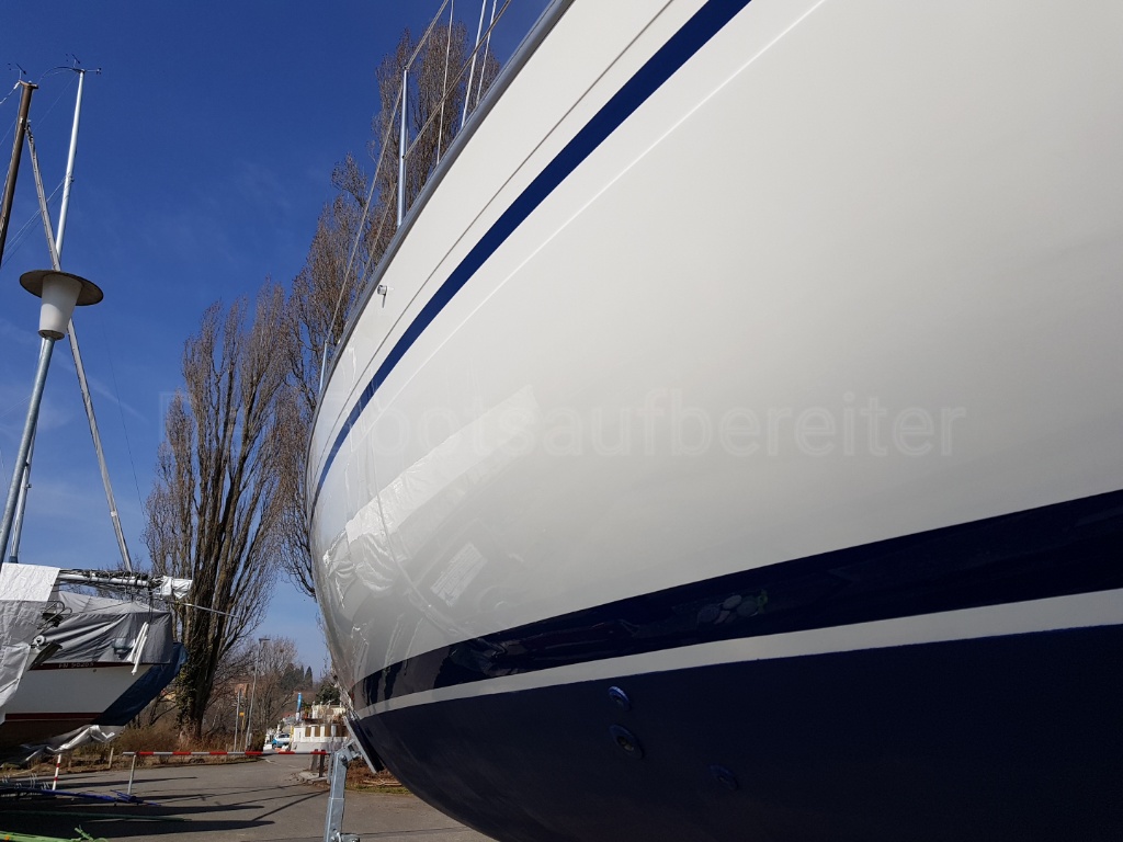 Damit das Gelcoat wieder geschützt ist wurde die Bavaria mit der Langzeitversiegelung von NautiCare versiegelt.