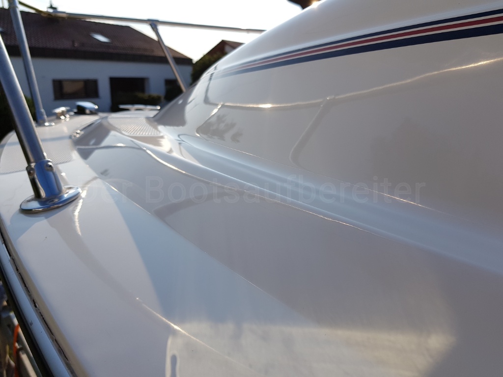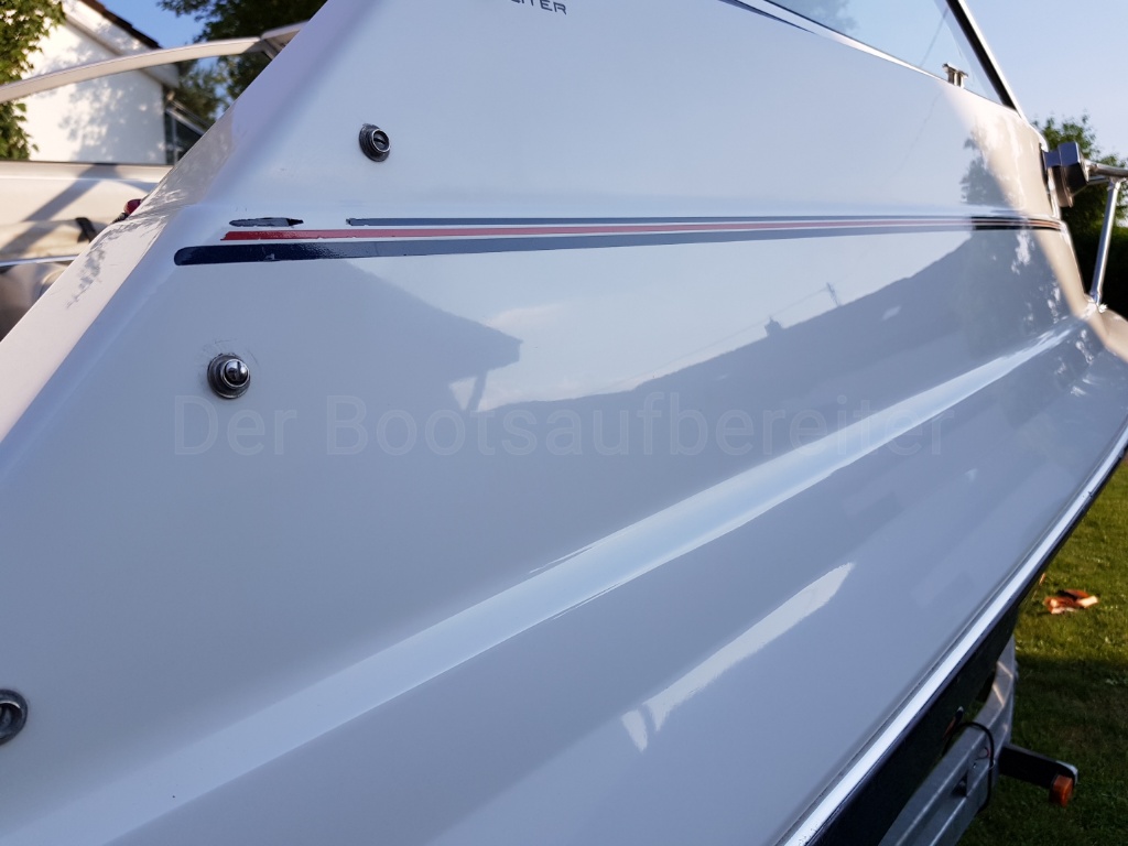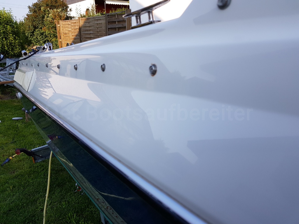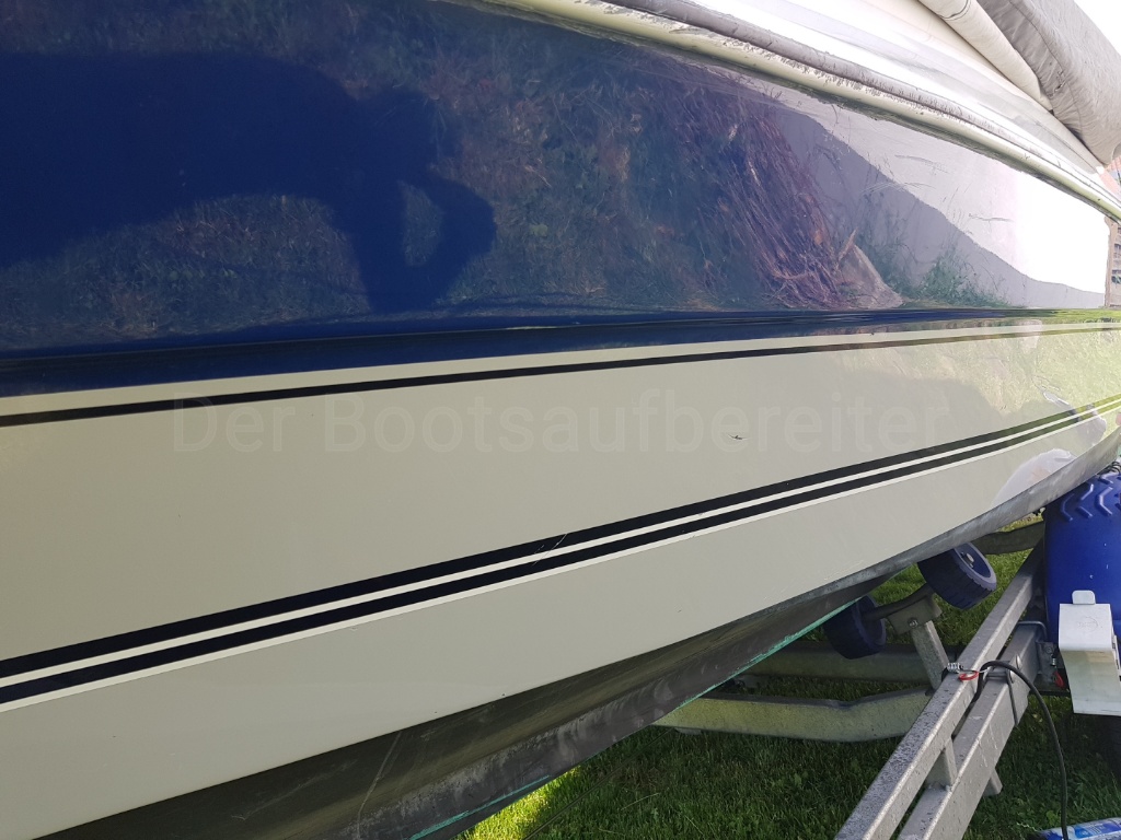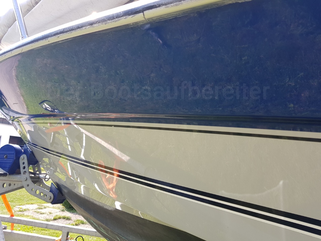 Die Bordwand wurde in zwei Schritten wieder aufpoliert. Zuerst mit einer mittleren Schleifpolitur. Zum Schluss kam noch eine Finish-Politur für den Endglanz zum Einsatz.