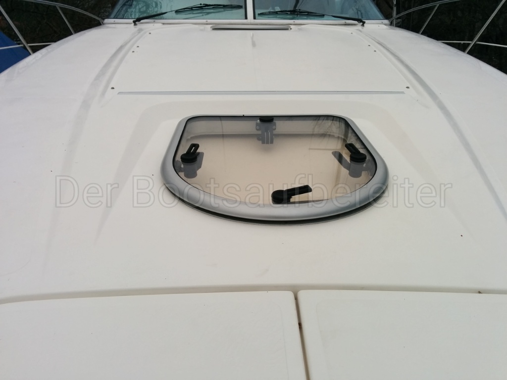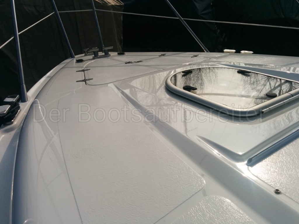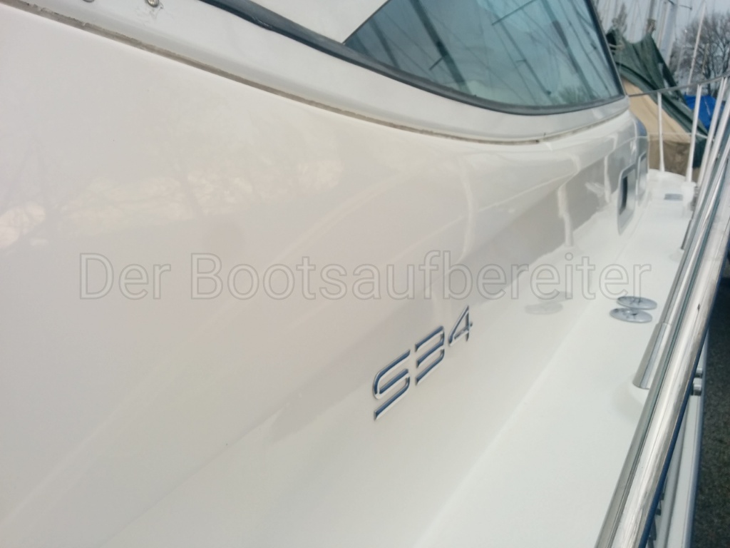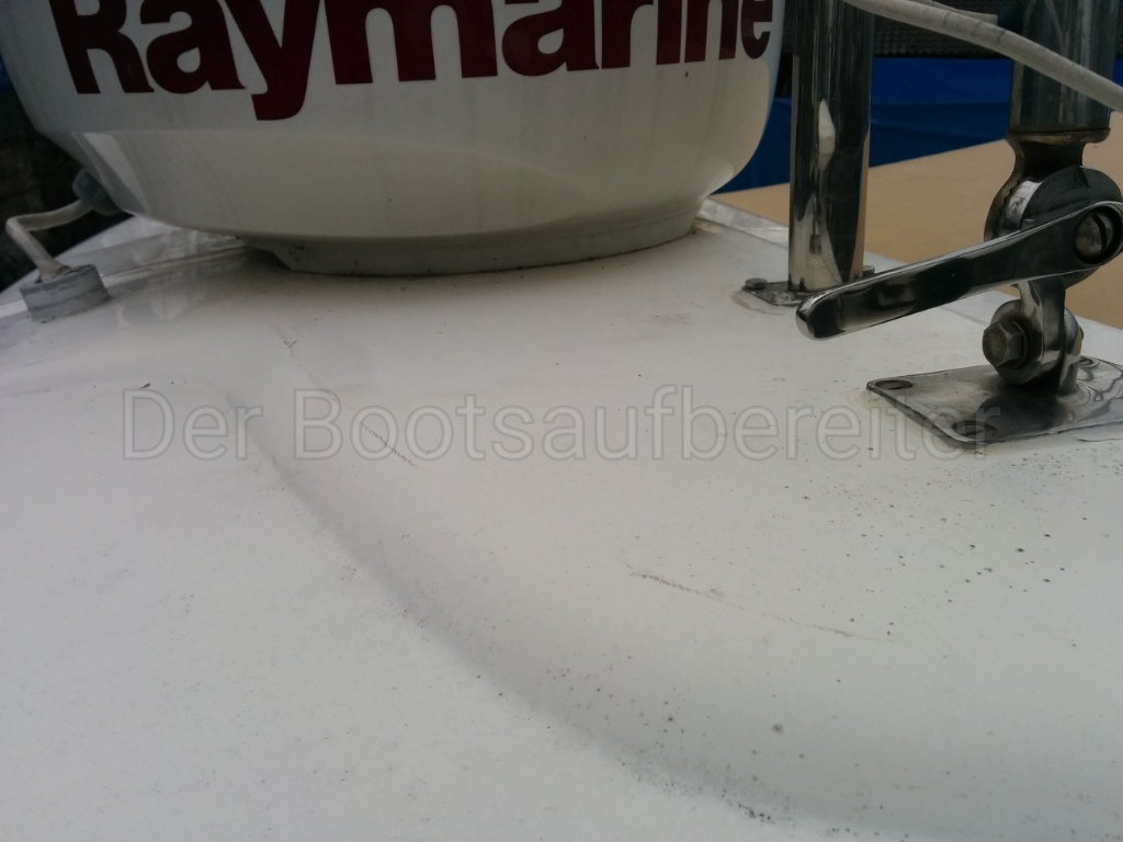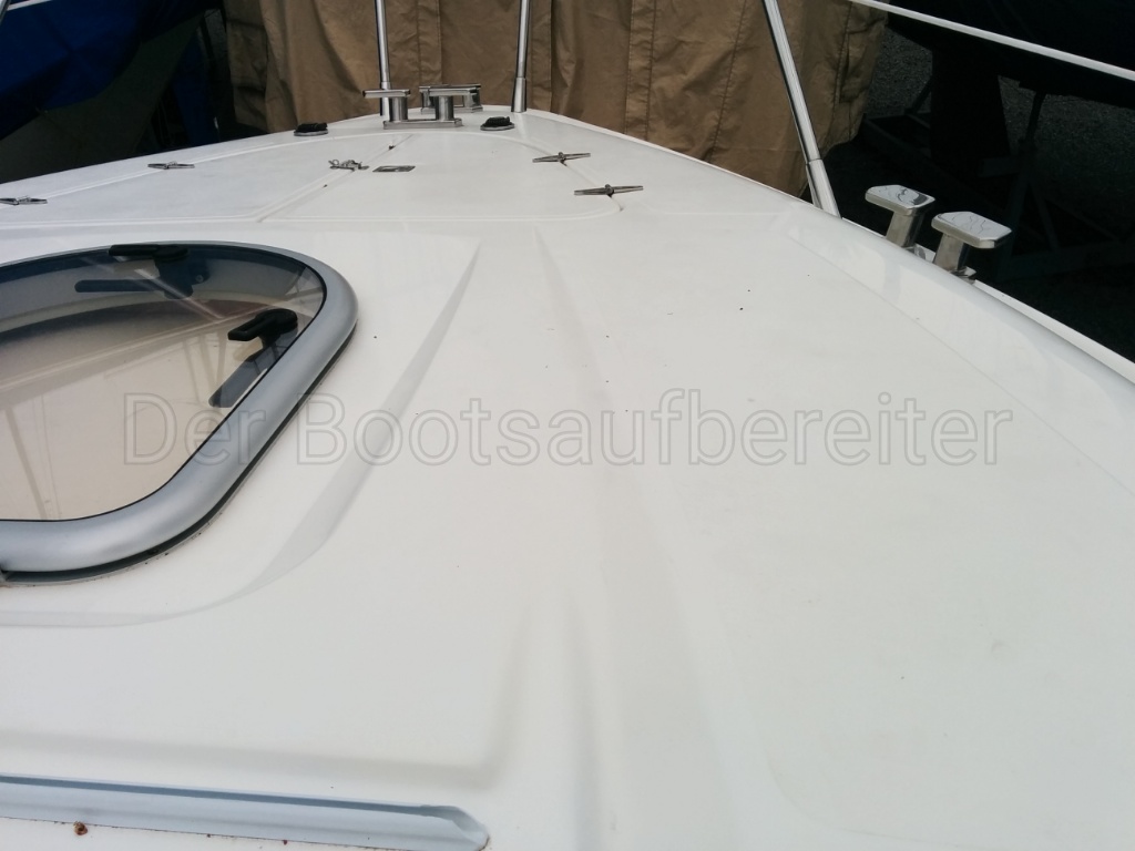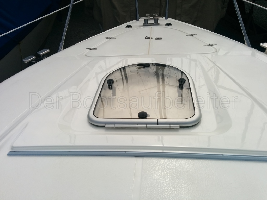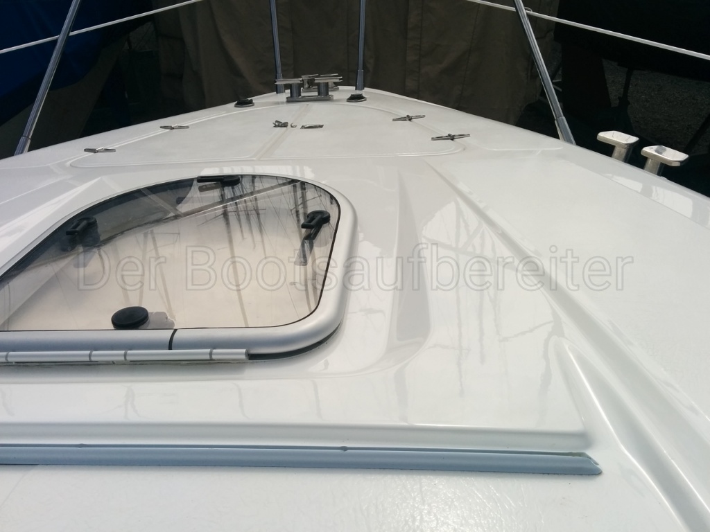 Diese Sealine 34 war am Rumpf durch die Witterungseinflüsse leicht, auf Deck etwas stärker verkreidet. Die Entscheidung des Skippers seine Yacht wieder aufzubereiten war auf jeden Fall richtig.