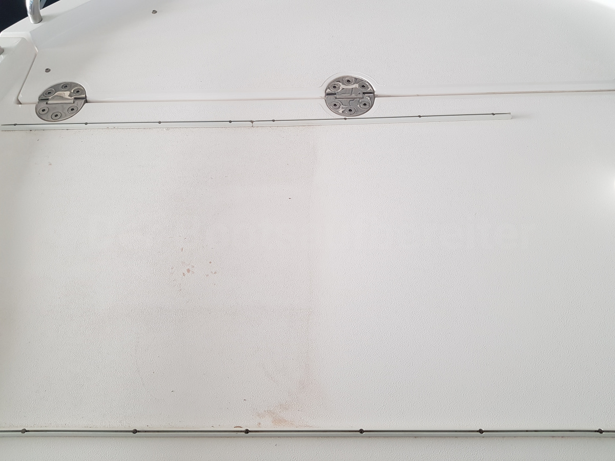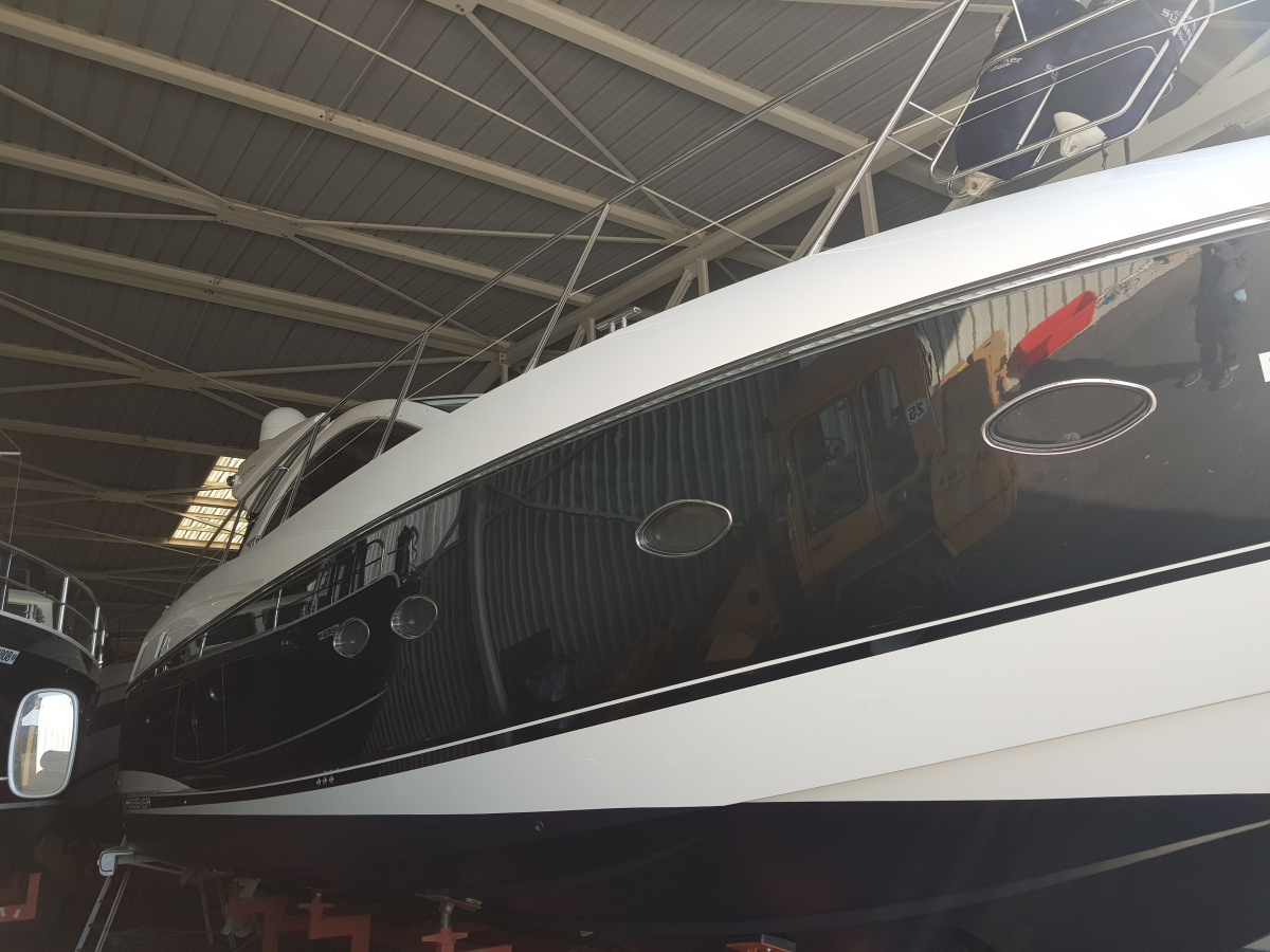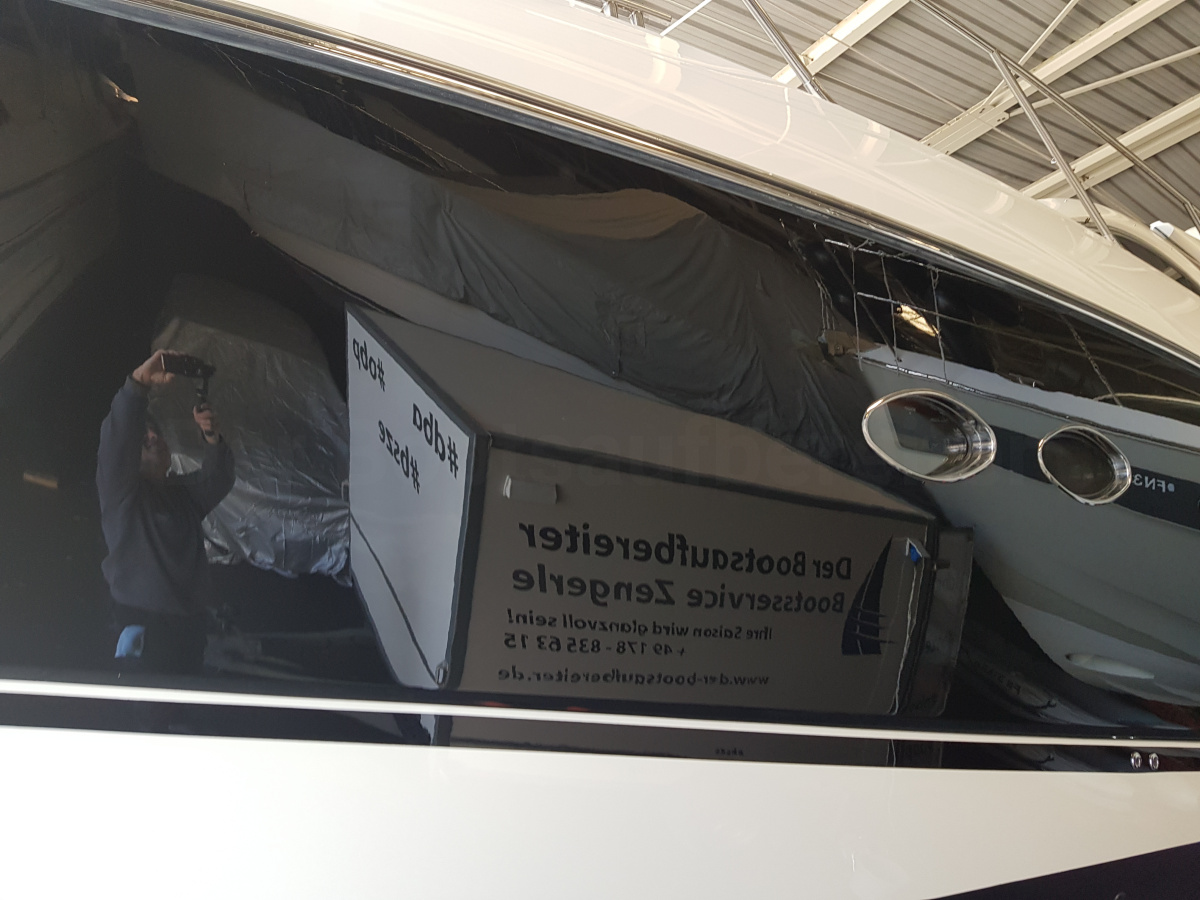 Die Sunseaker Portofino 48 war grundsätzlich in einem guten Zustand. Beim genaueren Hinsehen waren jedoch etliche kreisrunde Kratzer in der Bordwand und auf Deck. Diese galt es zu beseitigen und grundsätzlich das Boot wieder für die Saison vor zu bereiten.