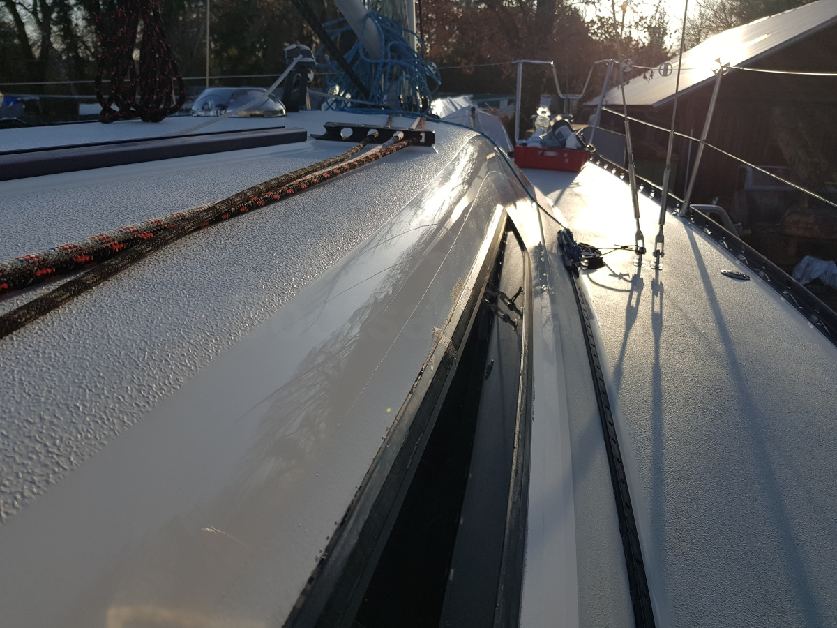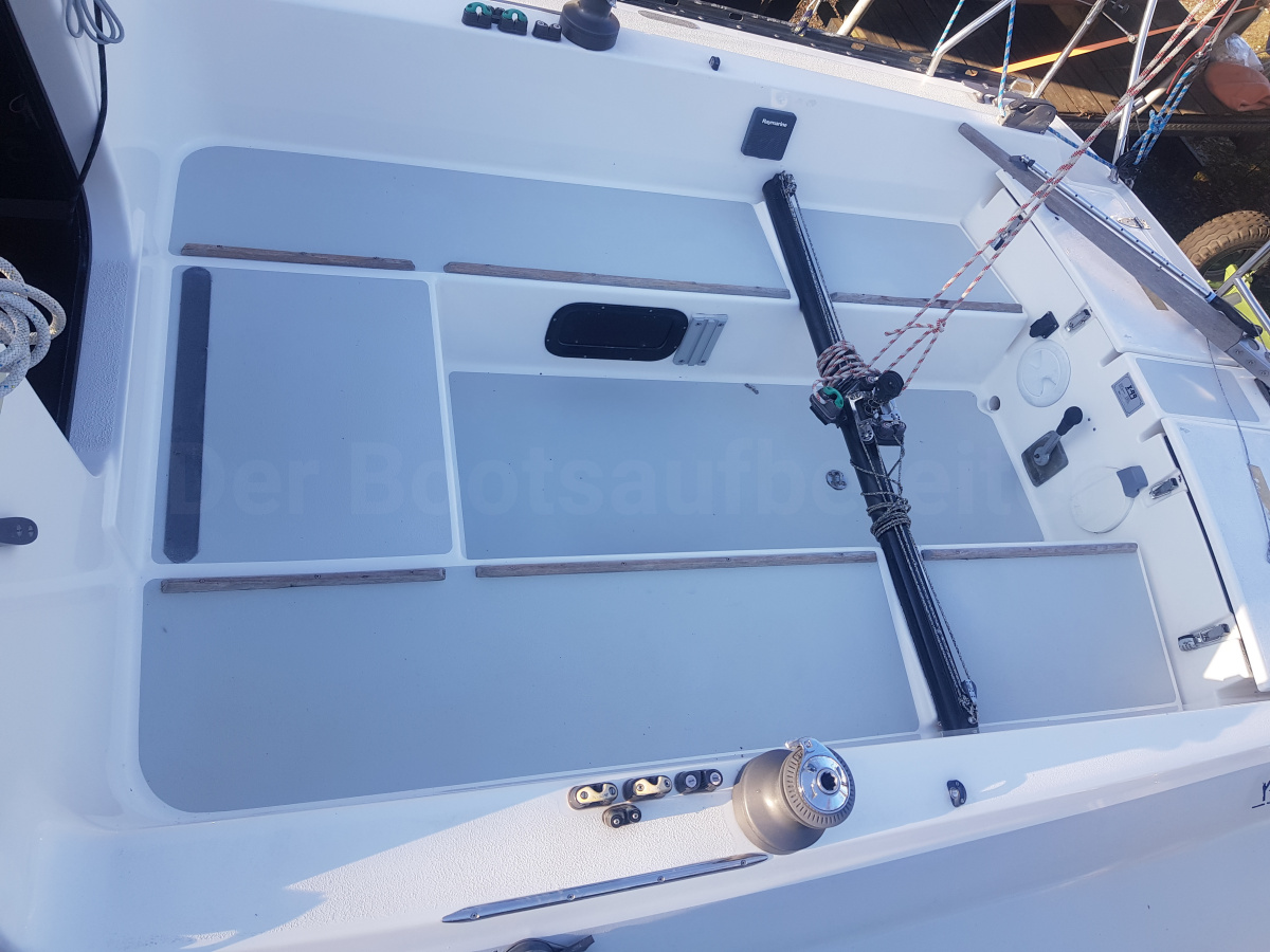 Zuerst wurde der Rumpf und das Deck vom groben Schmutz gereinigt und der Rumpf entkalkt. Bevor das Deck bearbeitet wurde, musste das Riffeldeck noch gereinigt werden.