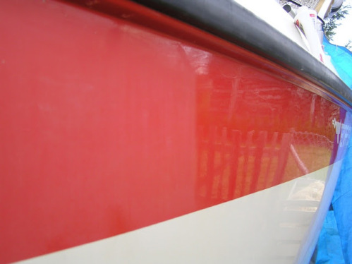 Rumfaufbereitung. Links im Bild sehr auffällig die Verkreidung des roten Streifens. Rechts im Bild nach der 2maligen Bearbeitung mit einer Schleifpolitur.
