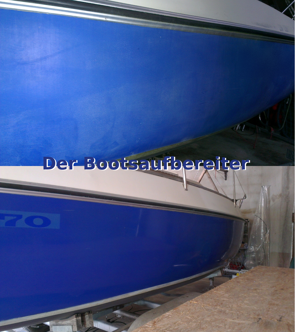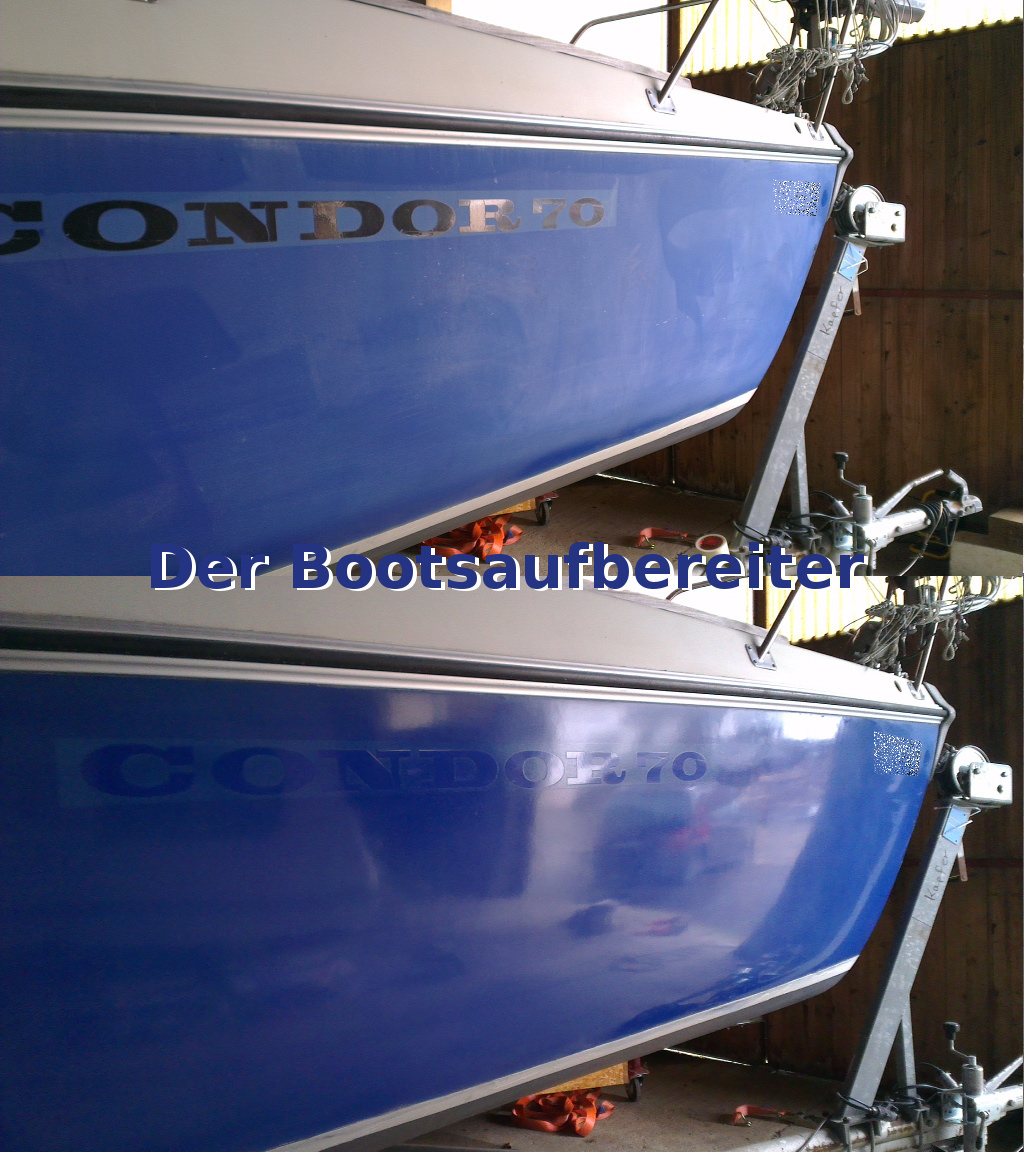 Diese CONDOR 70 war/ist extrem gezeichnet von der Sonne. Das Gelcoat ist völlig ausgekreidet. Diese „Beschädigung“ durch die Sonne geht tief bis in die unteren Schichten.
