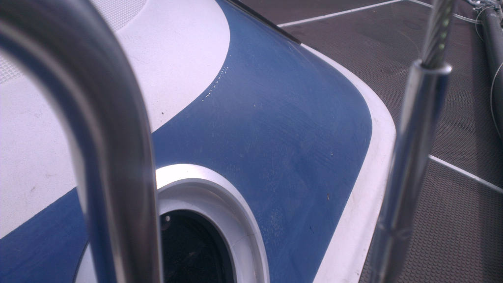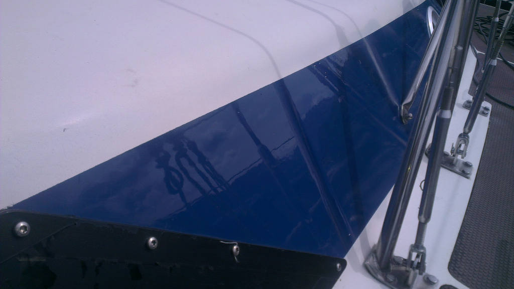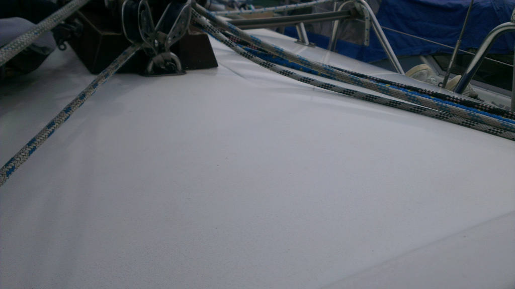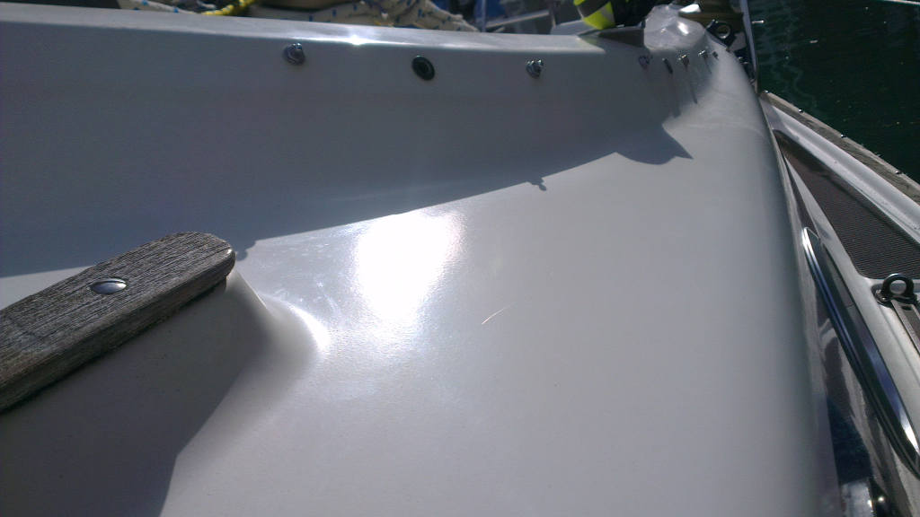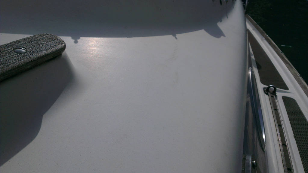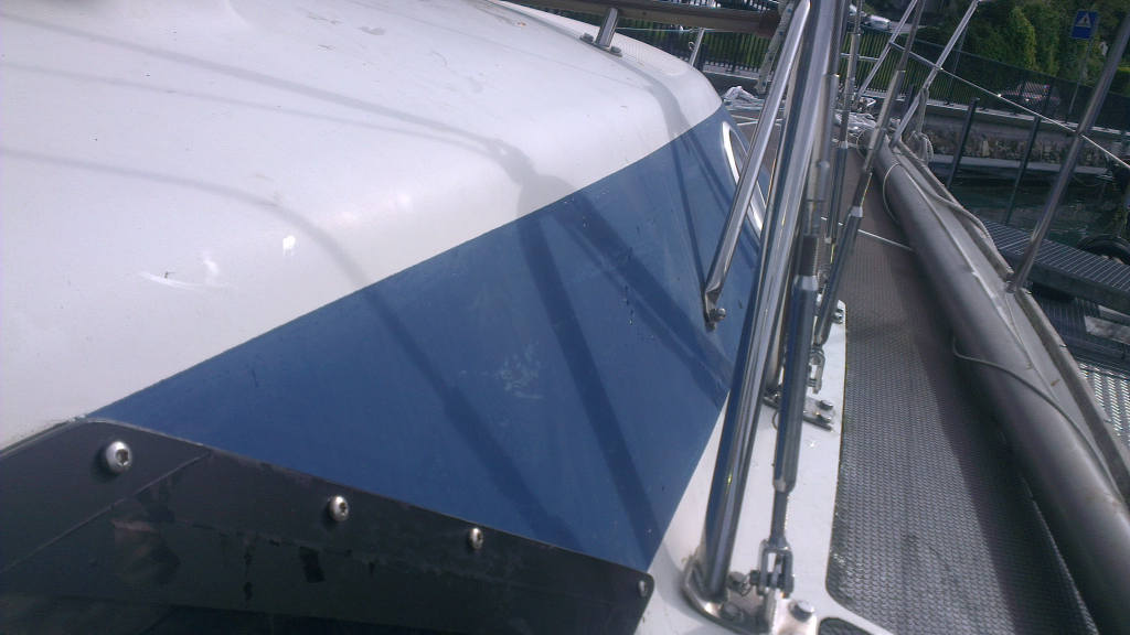 Hier musste in drei Stufen aufgearbeitet werden. Zuerst kam eine grobe Schleifpolitur zum Einsatz, um die stark verkreideten und mit hartnäckigen Flecken versehenen Stellen wieder aufzufrischen. Mit einer mittelgroben und feinen Politur wurde dann das Gelcoat vollständig geglättet.