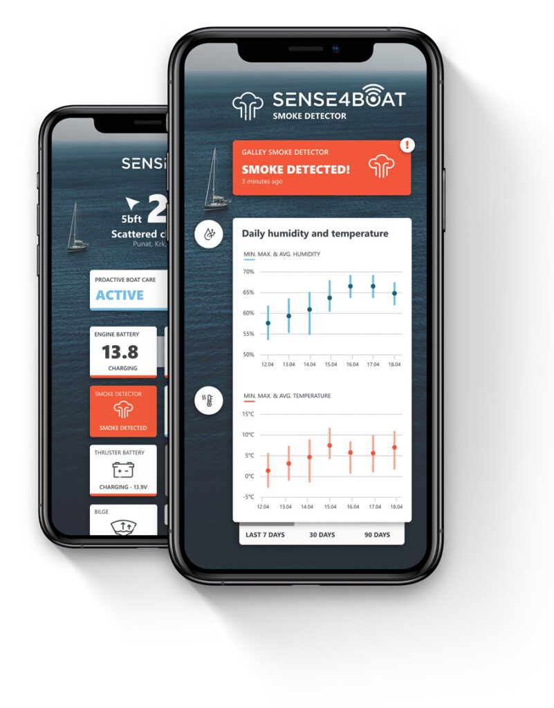 Überwachen Sie Temperatur und Luftfeuchtigkeit in den Bootskabinen und aktivieren Sie Rauchmelder mit der Sense4Boat-App