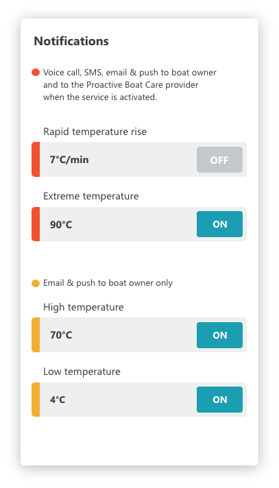Jede Temperaturänderung wird an die Sense4Boat-Zentrale gesendet und dort verarbeitet. Dort wird sie mit den benutzerdefinierten Schwellenwerten für spezifische Alarmzustände (niedrige/hohe/extreme Temperatur, schneller Temperaturanstieg) verglichen.